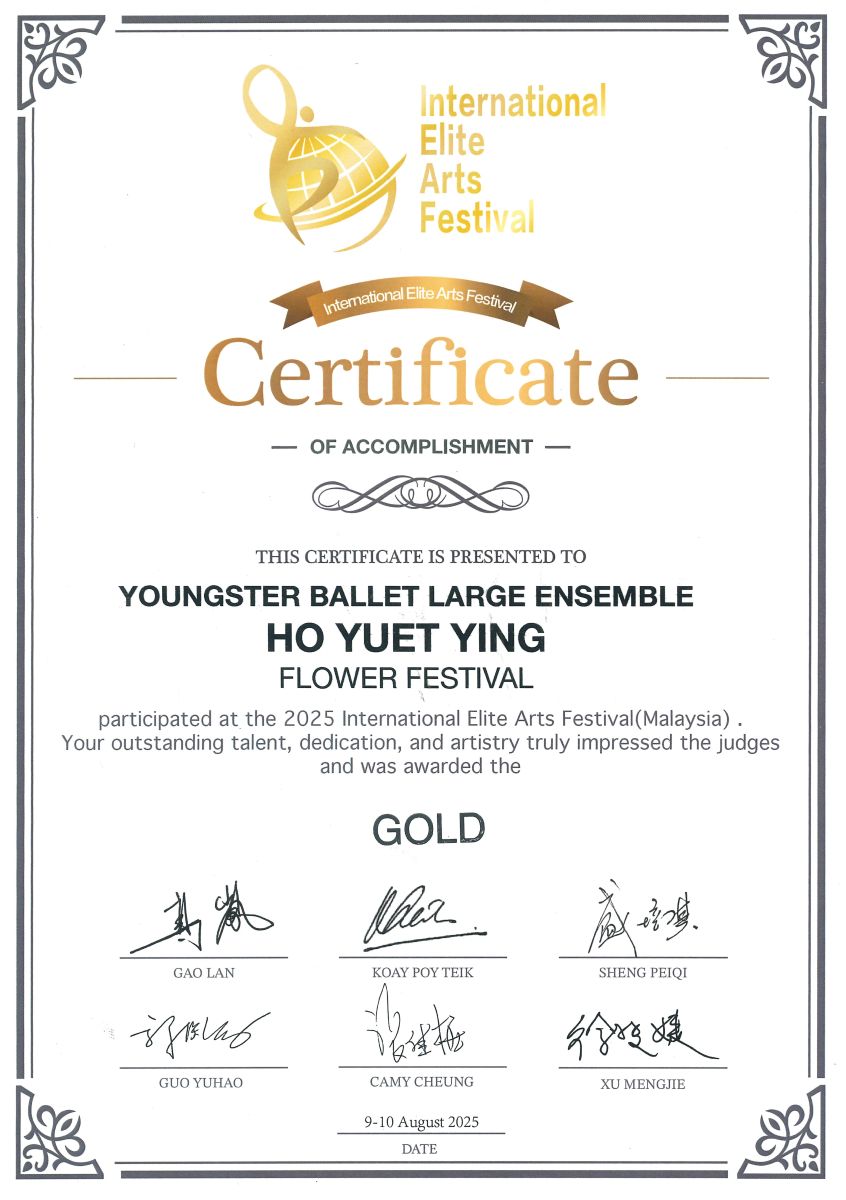 Student Ho Yuet Ying obtained the Gold Award in the 2025 International Elite Arts Festival (Malaysia) for Youngster Ballet Large Ensemble Flower Festival
