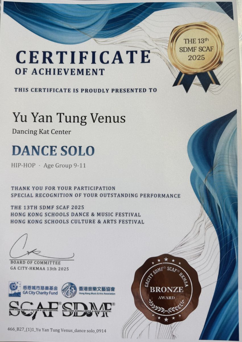 Student Yu Yan Tung Venus obtained The 13th SDMF SCAF 2025 Dance Solo HIP-HOP Age Group 9-11 Bronze Award