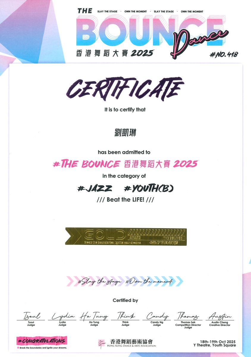 本校學生劉凱琳在 THE BOUNCE 香港舞蹈大賽2025 JAZZ YOUTH(B) Beat the LIFE! 榮獲金獎