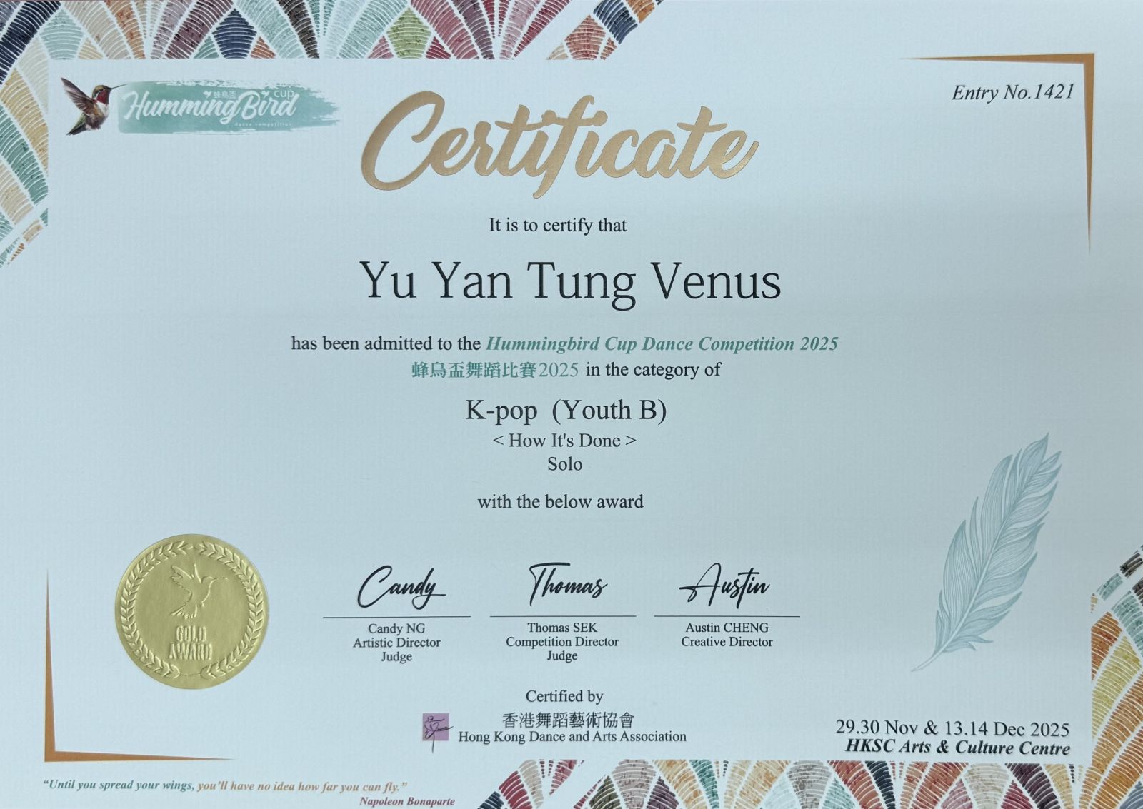 Student Yu Yan Tung Venus obtained The Hummingbird Cup Dance Competition 2025 in K-pop (Youth B) <How It's Done> Solo with Gold Award Rank 1