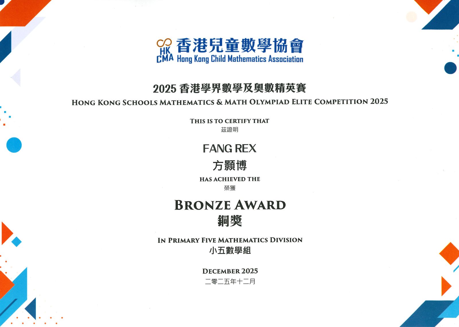 本校學生方顥博在香港兒童數學協會2025香港學界數學及奧數精英賽小五數學組榮獲銅獎