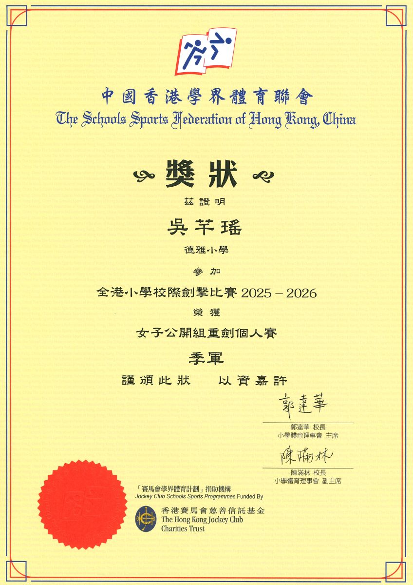 本校學生吳芊瑤在中國香港學界體育聯會全港小學校際劍擊比賽2025-2026榮獲女子公開組重劍個人賽季軍