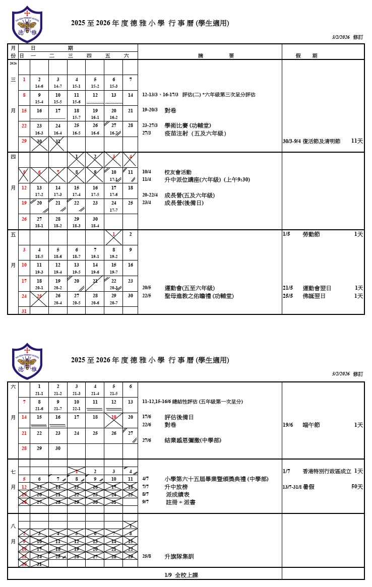2025至2026年度德雅小學行事曆(學生適用) 三至八月(下載PDF格式)